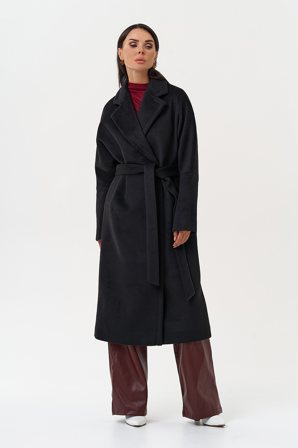 Силуэт - прямой Цвет - черный Длина - 115 см Вид полотна - тканое Состав полотна - шерсть 80%, п/э 20% Вид застежки - кнопки Крой воротника - английский воротник Фасон рукава - спущенное плечо, длинный Фасон кармана - прорезной Пояс |