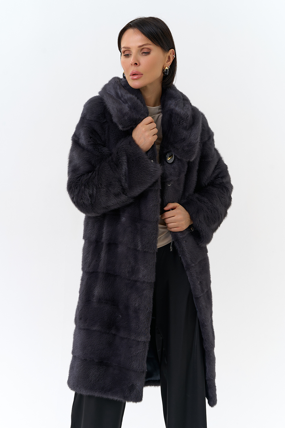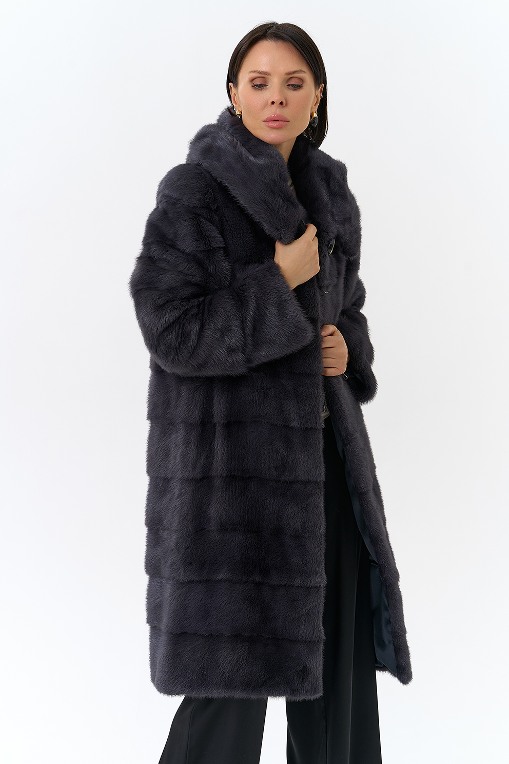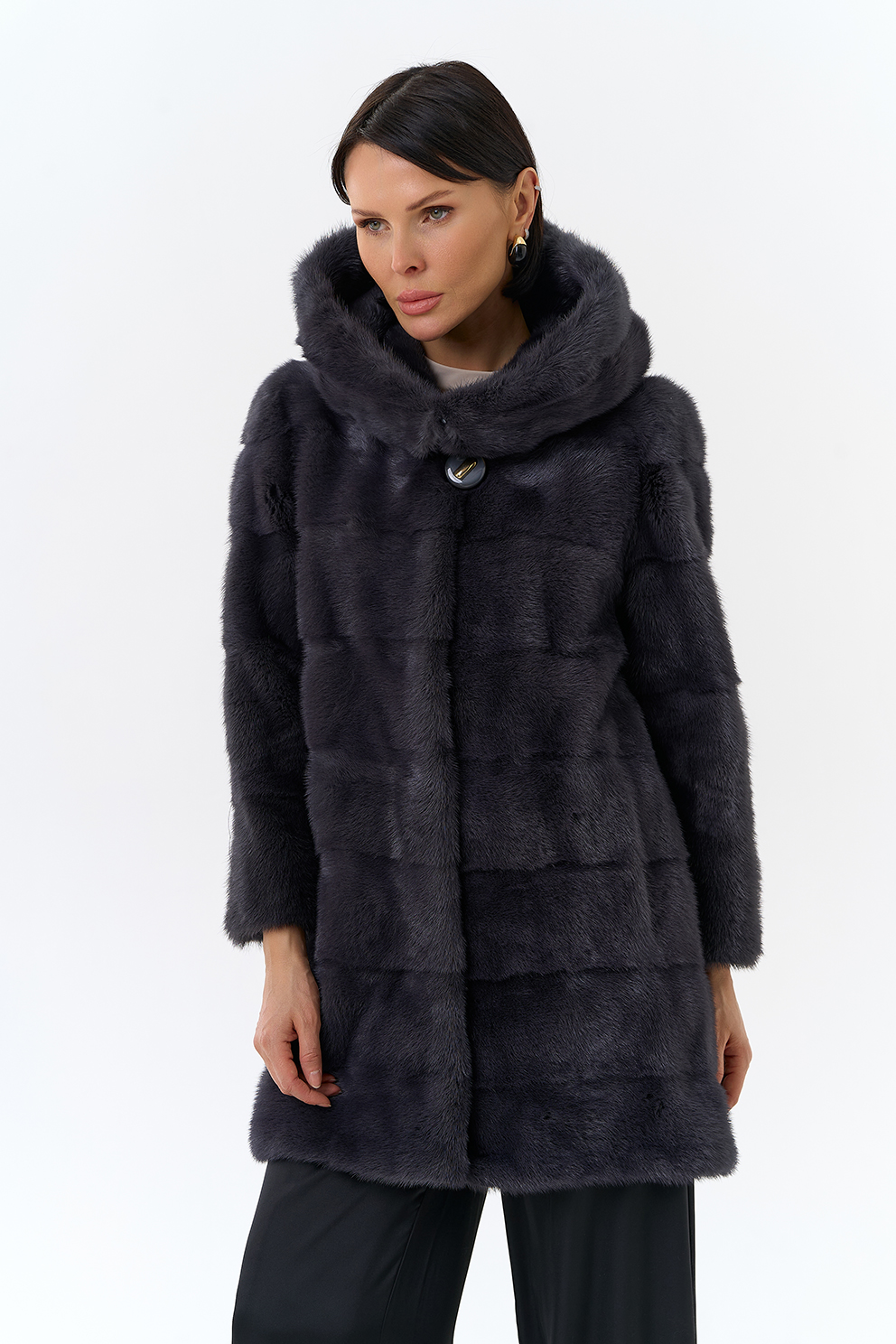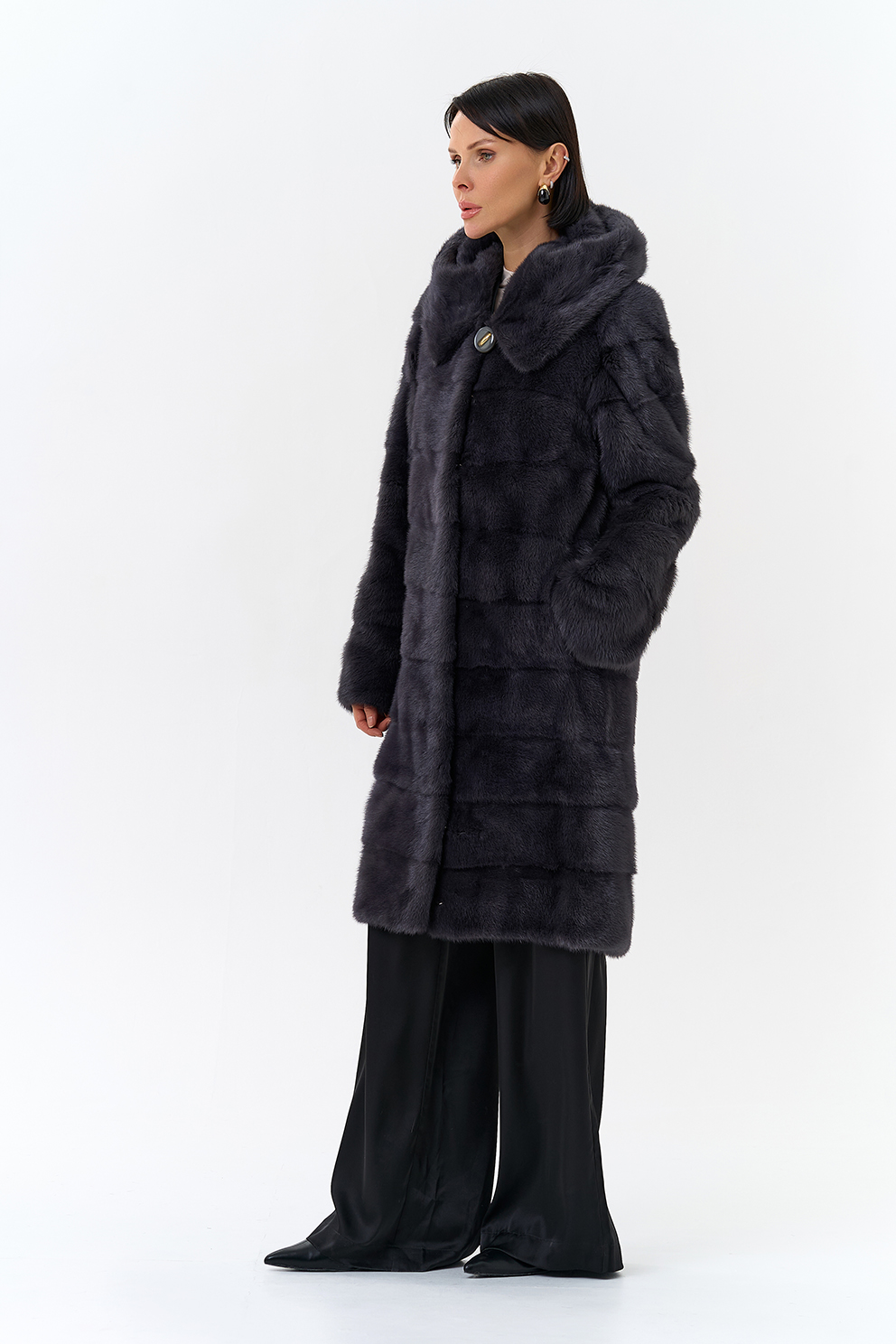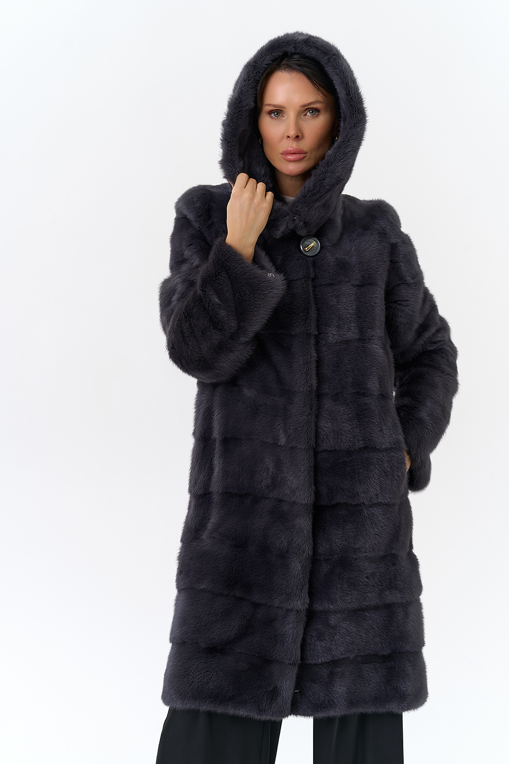 Норковая шуба трансформер в поперечном крое с капюшоном в цвете графит. Каждый день новая модель! Длина изделия трансформируется до 80 см,а рукав до длины ⅞. Шуба дополнена аккуратными пуговицами и крючками.